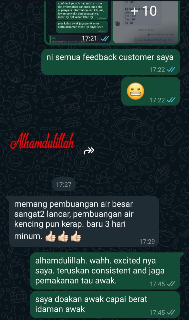 Puan Azmah teruja kongsi pengalaman buah pinggangnya yang tinggal 1 berfungsi efektif semula. Berat turun 10kg, kencing tak lagi berkapuh, bengkak kaki surut, & tiada lagi sakit kaki bila berjalan jauh.